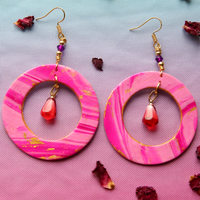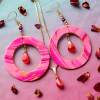 This collection's Pom de résistance are these Pomegranate Molasses Statement Earrings. Made with custom pink, white, and fuschia marbled clay with gold accents and adorned with beautiful glass pomegranate seeds, thick gold paperclip chain and vibrant crystal to really make these special earrings pop.