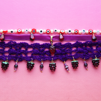A truly special one of a kind handmade luxurious grape choker - soft, adjustable, and featuring a bounty of beautiful grapes, crystals, and beads to celebrate Passover and look luscious in this Seven Species appreciation piece all year round. Featuring slighty metallic purple yarn crocheted from a cotton and wool blend into a delicate lace choker, with an adjustable button closure and carefully selected lightweight adornments for a maximalist yet comfortable look.