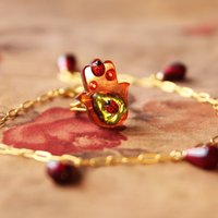 Recycled amber acrylic hamsa is adorned with glass leaf, vintage glass lady bug cabachon and red crystal. This ring can be adjusted to be worn as a stacking ring higher on the finger, or alone as a beautiful solo statement.