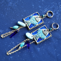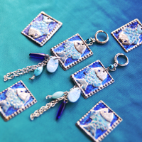 A Judeofuturist labour of love, antique Moroccan tiles are restored, hand-painted and glazed, and adorned with natural and handmade adornments featuring clay, crystal, and Czech glass. Silver chain is threaded through the earring to create a beautiful effect of water in motion trailing behind the fish. Wearable art in motion for your ears.