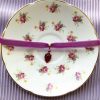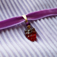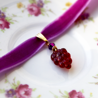 Nothing communicates abundance like one of the seven species symbolising nourishment and prosperity - grapes. Handmade rich purple glass grapes and accenting crystal adorn handmade recycled velvet chokers made with a rich lilac velvet, proving stylish elegance can also be sustainable.