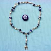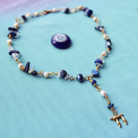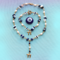 Introducing the ultimate Blue and White Am Yisrael Chai Judaica. This beautiful one of a kind hand-beaded gemstone Chai necklace features lapis lazuli, opal, and blue and white freshwater pearl, designed to dangle gracefully below the collarbone. Complete the look and match with our Gold Chai Beaded Charm Bracelet.