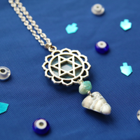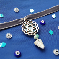 This very special one of a kind necklace features silver floral Magen David pendant mounted on naturally dyed blue shell, adorned with freshwater seafoam pearl and glazed calcified shell with natural striations resembling a shark tooth. This versatile necklace can be worn as beachwear or occasionwear and comes presented on silver chain or steel blue velvet choker - your choice!