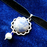 Sodalite-ful Silver Reversible Crystal and Pearl Magen David Necklace
