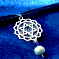 Treat yourself to two beautiful necklaces in one! This reversible Magen David design can be worn two ways, to either show off the Star of David side of the pendant or the sodalite and silver floral pendant that looks like a beautiful flower. Adorned with a seafoam freshwater pearl and crystal, this one of a kind design allows you to control your comfort in style.