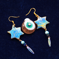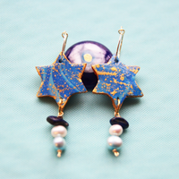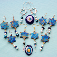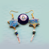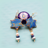 Our Surf the Galaxy clay design is back and better than ever in our new blue marbled rustic clay Magen David earrings. 4 special designs to dangle gracefully from your ears, with a touch of Judeofuturist magic and precious adornments - from freshwater pearls, Czech glass icicles, and polished lapis lazuli. These one of a kind earrings will have you feeling like the brightest star in the galaxy.