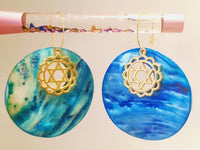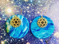 Adorn yourself in a cosmic slice of sea and carry the Kinneret with you wherever you go! These hand-carved and hand-painted shell earrings are finished with a gold-plated magen david pendant, bringing sea and sky together in a judeofuturist vision of beauty and pride.