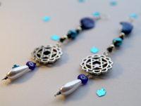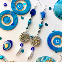 These stunning dangly statement earrings bring the sea and stars to life, cascading from the ears like a living aquatic sculpture. Hand-crafted with salvaged abalone pendants mounted with silver floral motif magens and featuring a carefully sourced assortment of sea-hued glass, crystal, shell, and freshwater pearl, these one of a kind earrings are the wearable judaica of underwater fairy tales come true.