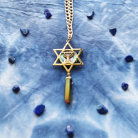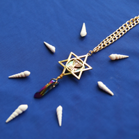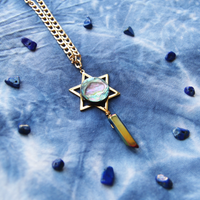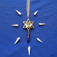 This one of a kind design inspired by the sea and featuring a gorgeous moon-like slice of abalone combined with complementary rainbow quartz is the statement Judaica necklace to end all statement necklaces. The unique reversible pendant design allows you to showcase the iridescent abalone side or a crystal-accented menorah Magen David with the subtle, earthy underside of the natural abalone shell underneath. Either way you choose to wear it, this one of a kind necklace will have you turning heads whilst channeling the power of the sea. Presented on blue velvet choker, gold-plated layered paperclip chain, or available to upgrade to 18K Cuban chain. Please indicate your preference in the check out notes.