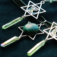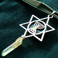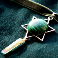 Summon abundance and opportunity with this powerful green gemstone Judaica creation. Featuring silver menorah Magen David pendant combined with handmade malachite cabachon presented on lush green velvet and adorned with peridot and green quartz, this beautiful one of a kind choker will fill your life with verdant beauty. Presented on lush green velvet choker or silver chain, please indicate your preference in the check out notes.