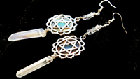 When mother nature brings on the snow storms, we bring on our protective wearable art to capture the beauty of winter without the cold. Featuring one of a kind reversible opaline magen david pendants adorned with quartz, crystal, and recycled chandelier glass for an ethereal one of a kind look. Wear them as statement earrings or together with the matching Opal and Ice Floral Choker as a powerful set!