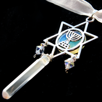 When mother nature brings on the snow storms, we bring on our protective wearable art to capture the beauty of winter without the cold. Featuring one of a kind reversible opaline magen david pendants adorned with recycled chandelier glass, quartz, and crystal for an ethereal one of a kind look. Wear as a single statement piece or together with the matching Opal and Ice Menorah Magen David Earrings as a powerful set!