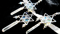 When mother nature brings on the snow storms, we bring on our protective wearable art to capture the beauty of winter without the cold. Featuring one of a kind reversible opaline magen david pendants adorned with recycled chandelier glass, quartz, and crystal for an ethereal one of a kind look. Wear them as singles or together with the matching Opal and Ice Menorah Magen David Choker as a powerful set!