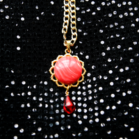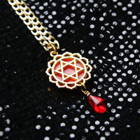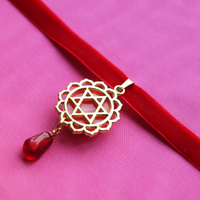 Treat yourself to two beautiful necklaces in one! This reversible magen david design can be worn two ways, to either show off the magen david side of the pendant or the beautiful handmade rhodochrosite cabachon that looks like a beautiful flower. Adorned with handmade pomegranate seed for luck and available on red velvet choker or 18k gold Cuban chain. Complete the look and pair with our Reversible Gold and Pomegranate Seed Magen David Earrings.