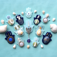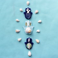 K - Heart of the Sea Beautifully designed from natural elements, the recycled navy acrylic hamsa is adorned with foraged coral and sea glass arranged to create a heart
