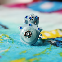 L - High Seas Filigree The statement ring to end all statement rings, this gorgeous light sea acrylic hamsa ring is adorned with restored vintage silver filigree, glass evil eye, crystal, and a striking raw bolt of rose quartz