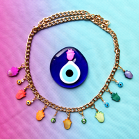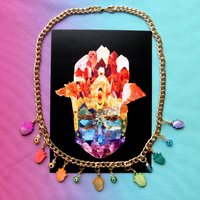 Celebrate Pride Month with a statement piece that radiates equal parts protection and love! This unique hand-carved shell gradient hamsa rainbow graces a stylish gold Cuban link chain, interspersed with vibrant glass evil eye beads and recycled crystal to truly dazzle and pop all through Pride Month and beyond