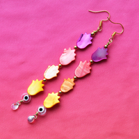 Ring in summer with the perfect beach-ready handmade shell adornments, the Sunset Hamsa Earrings! Hand-dyed shell hamsas arranged in a beautiful Sherbet-y sunset gradient adorned with champagne glass evil eye beads and iridescent teardrop accent create a gorgeous summer palette and the perfect protective accessory for the entire season. Pair with the beautiful one of a kind Sunset Hamsa Necklace and dazzle in this one of a kind set!