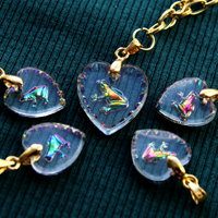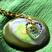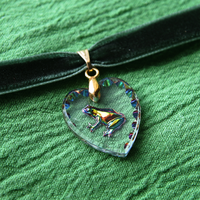 These exquisite heart-shaped Intaglio glass amulets are hand-carved with stunning ever-changing iridescent detail that beautifully transforms when it catches light.
