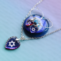 The exquisite heart-shaped Intaglio glass star of David amulets are hand-carved with stunning ever-changing silver detail embdedded in iridescent midnight blue glass that beautifully transforms when it catches light.