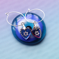 Iridescent Midnight Magen David Glass Heart Amulet Silver Hoop Earrings