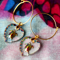 Tubular Turtle Iridescent Glass Heart Amulet Gold Hoop Earrings