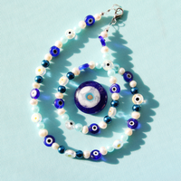 Introducing our new hand-beaded protective Glass Evil Eye and Pearl necklace. This handmade necklace features royal blue and iridescent glass blue and white evil eye beads and freshwater pearl in classic, seafoam, and turqoise to create a shimmering protective adornment you can wear solo or layered to form a cascade of beautiful blue and white.