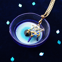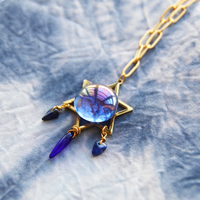 The Judaica of your dreams has arrived and it's a vision in blue. This one of a kind gold reversible pendant is created with salvaged synagogue stained glass and fashioned into a whimsical reflective cabachon with polished lapis lazuli points and finished with stunning electric blue Czech glass icicle.