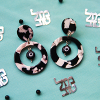One of a kind mod style evil eye earrings to shimmer and shine. Made from 100% recycled vintage acrylic with beautiful black, white and marbling, adorned with black evil eyes.