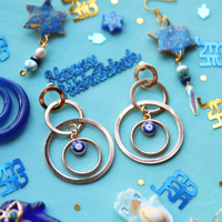 Restored vintage hoops come together to create a beautiful nesting cascade with central blue evil eye adornment