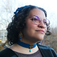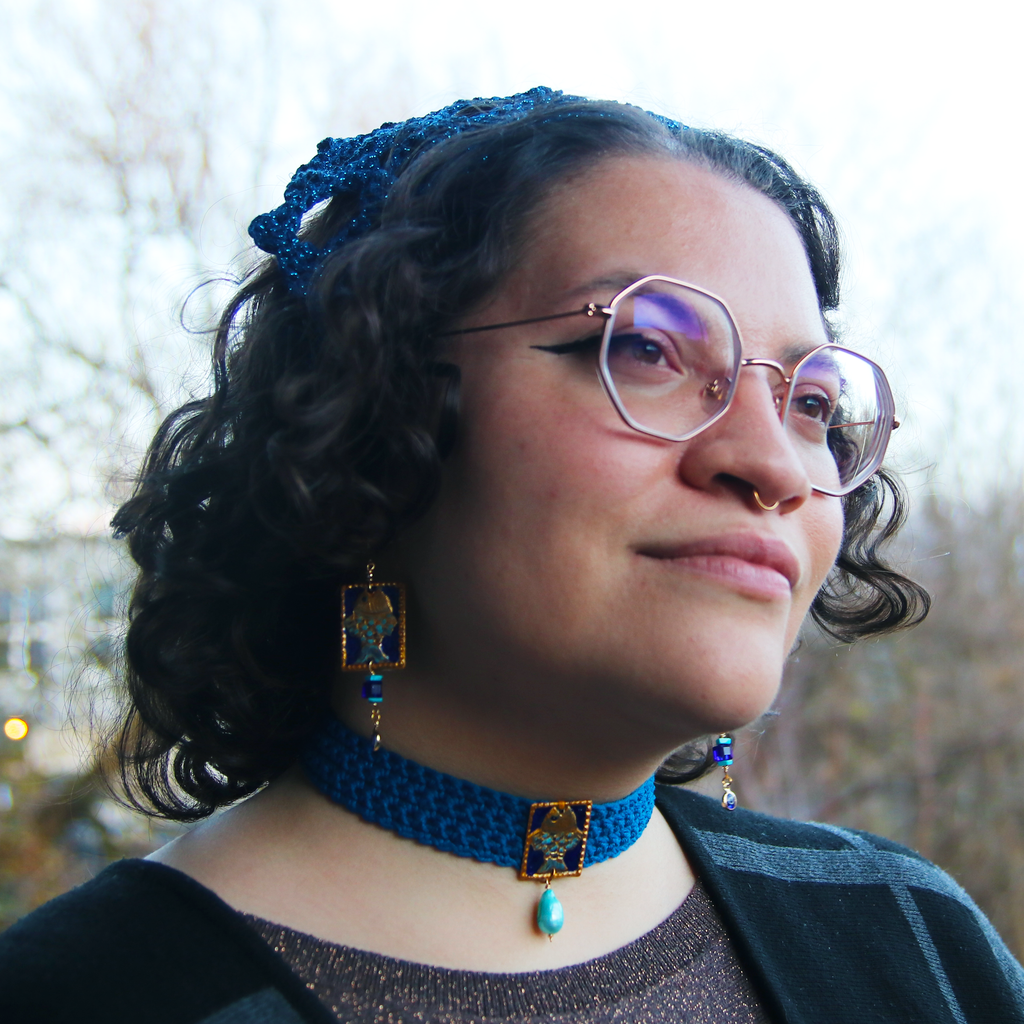 A Judeofuturist labour of love, an antique Moroccan tile is restored, hand-painted and glazed, and adorned with large freshwater pearl to create a beautiful effect of water in motion trailing behind the fish. Handmade from silky smooth rich blue cotton made custom to your measurements, our crochet medieval fish choker necklace and matching bracelet make a full set with our newly restocked earrings.