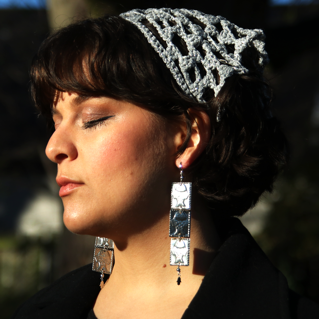 A Judeofuturist labour of love, antique Moroccan tiles are restored, vertically suspended, and adorned with miniature silver hamsas. Beautiful in motion, lustrous, and abundant in luck and protection. Wearable art in motion for your ears.