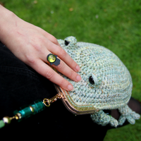 Made from recycled high polish black acrylic and vintage glass snake cabachon with gold shades that change when they catch the light. The ring band is adjustable allowing rings to be worn anywhere on the finger so they can be stacked with our other Foraging Forest Hamsa Rings.