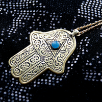 Engraved Blue Stone Brass Magen David Hamsa Necklace