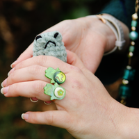 Made from recycled sparkly green acrylic and vintage glass snake cabachon with gold shades that change when they catch the light. The ring band is adjustable allowing rings to be worn anywhere on the finger so they can be stacked with our other Foraging Forest Hamsa Rings.