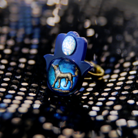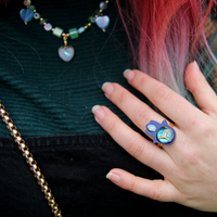 This one of a kind whimsical hamsa ring is a perfect hand adornment for dog lovers and nature enthusiasts. Made from recycled midnight blue acrylic and Intaglio glass dog and opal glass cabachons to create a beautiful nature scene. The ring band is adjustable allowing rings to be worn anywhere on the finger so they can be stacked with our other Foraging Forest Hamsa Rings.