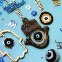 Adorn yourself in your very own piece of the night sky with our Chanukah-exclusive starry night statement Hamsa. Hand-crafted from specially mixed, hand-painted and glazed clay, adorned with obsidian glass and gold ayin, and presented on gold link chain or thick Cuban chain. Pair with our Starry Night Earrings to create a powerful set.