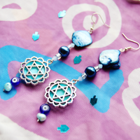 Let these stunning sea-hued beauties transport you to tranquil azure waves, as you bask in their natural sea-inspired materials. Created using salvaged metals, natural shell, freshwater pearl, crystal, and glass, these one of a kind earrings will summon the sea to you no matter where you are in the world. Complete the look and pair with one of our one of a kind Mayim Magen David Necklaces: Azure Sea Silver Drop Necklace or Freshwater Pearl and Abalone Mayim Magen Necklace.