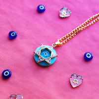 Vibrant hues and sea come together in this beautiful necklace. Featuring striking gold-plated and cubic zirconia pointed Magen David pendant mounted on azure shell and adorned with either sky blue or royal blue glass evil eye adornment. Both precious and protective, this sea-inspired treasure is a protective adornment for all seasons.