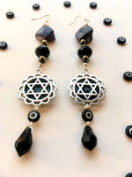Designed to capture the iridescent black sea on a moonless night, the Lunar Eclipse Mayim Magen earrings make a stunning statement featuring black crystal, shell, and glass to elevate this classic black and silver design.
