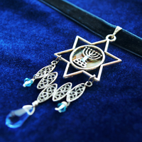 This one of a kind design inspired by the sea and featuring a gorgeous moon-like slice of abalone is the statement choker to end all statement chokers. Dripping with crystal accents adorning salvaged filigree, the unique reversible pendant design allows you to showcase the iridescent abalone side or a crystal-accented menorah magen with the subtle, earthy underside of the natural abalone shell underneath. Either way you choose to wear it, this one of a kind, show-stopping choker will have you turning heads whilst channeling the power of the sea.