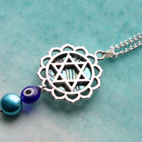 The Turqoise Pearl and Evil Eye Silver Mayim Magen Necklace is an elegant and timeless piece of wearable Judaica inspired by the sea. Featuring custom fitted abalone pendant backing paired with glass turqoise pearl and glass evil eye bead, this one of a kind piece of wearable art channels the sea no matter where you are in the world.