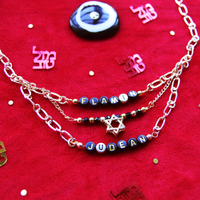 For those with a fiery side to go with their Jewish pride, we introduce our one of kind Flamin' Judean statement necklace. Hand-beaded with gold and black acrylic and presented on triple cascade chain with a beautiful interlocking gold and Cubic zirconia studded star of david. Finished with handmade starry night evil eye bead closure for glamour in the front and the back.