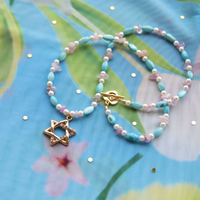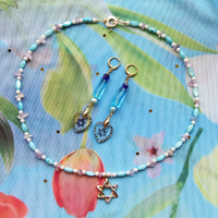 Whimsical one of a kind necklace featuring Star of David pendant with a selection of pastel crystals and a hand-beaded necklace featuring shell, pearl, and polished gemstone of your choosing, in any colourway you'd like. Leave your chain length, material, and colour preferences in the checkout notes.