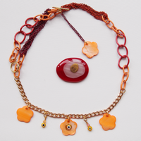 The ultimate transitional statement piece to take you from summer to fall, deep auburn, fiery red, bright orange, and complementary yellow and gold accents form the versatile palette that creates this one of a kind reversible statement necklace which can be worn 2 amazing ways!