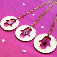 This one of a kind necklace is a stunning combination of our Abundance Hamsa necklace and Iridescent Glass Heart Magen David Necklace. Handmade Intaglio glass pendant with iridescent inset Magen David adorns a hammered gold-plated bronze hamsa pendant presented on gold plated chain to make a strong and simple solo accessory or a perfect layering piece. Complete the look and pair with our Iridescent Magen David Glass Heart Amulet Gold Hoop Earrings