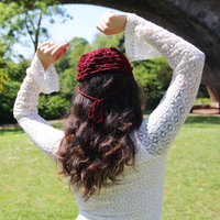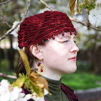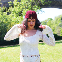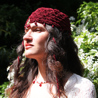 The Abundance Gold and Pomegranate Judith Cap is created with metallic gold and rich pomegranate red yarn with including braided adjustable ties adorned with pomegranate seeds. We offer the option to add glass and gold pomegranate seed and crystal adornments weaved into the cap's scallop fringe, an additional option of a detachable Filigree Fig statement pendant, or if you wish to have custom pendants/adornments made for your cap or to incorporate pendants from the shop into your cap, please leave a note when checking out and we will follow up with available options.