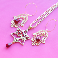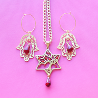 Branch out and stand tall with this one of a kind piece of wearable statement Judaica. The Abundance Magen David combines two powerful symbols of Judaism together, with a tree of life relief featured within a Star of David. Adorned with ruby leaf cystal and a handmade pomegranate seed for abundance and luck and presented on 18k Cuban chain for a substantial statement piece.