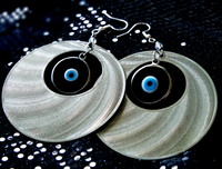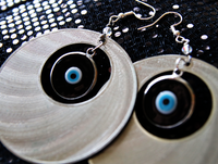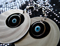 Block out the negativity with these stunning one of a kind Ayin Hara Reflector statement earrings. Fashioned from restored vintage materials, high-shine reflective metallic discs are adorned with handmade black glass nazar pendants and vintage opalescent crystal beads. When these beauties hit the light, they are a marvel to behold.