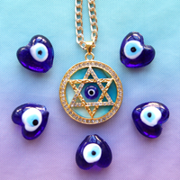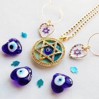 Express your Jewish pride with this one of a kind Gold Seashell and Glass Ayin Statement Magen David Necklace! This unique interwoven Cubic Zirconia design adds depth to this striking pendant fitted with natural gradient blue to white shell and mounted with glass evil eye bead to add a sea-inspired protective touch. This necklace is perfect as a layering piece or a statement on its own.